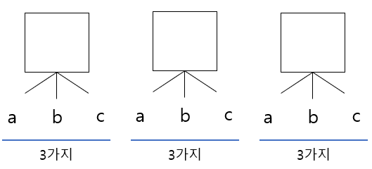 하지만 중복 순열의 경우에는 첫 번째 자리에 가능한 문자의 경우의 수가 3가지,